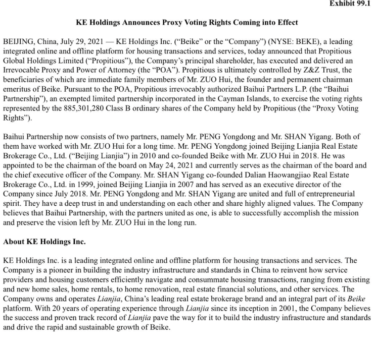 焦点财经讯 2021年7月29日,KE Holdings Inc.(贝壳,纽约证券交易所代码:BEKE)公告宣布,该公司的主要股东Propitious Global Holdings Limited(“Propitious”)已执行并交付了不可撤销的代理和授权书(“POA”)。Propitious最终由Z&Z信托控制,其受益人是左晖,贝壳创始人、名誉董事长。