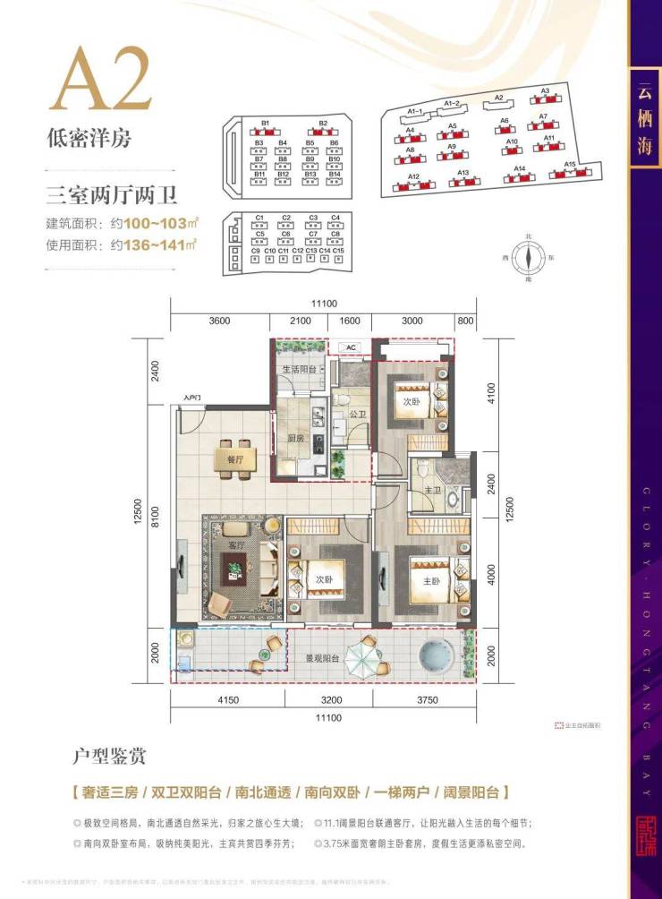 2、A2 100平米三房两卫,使用面积136-141平米