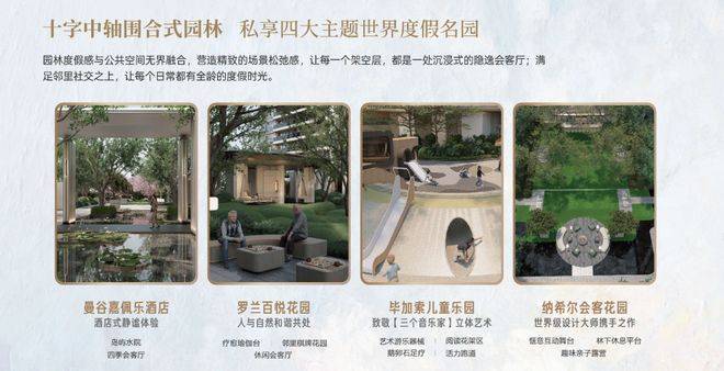 ◎ 约5000m²十字中轴私享园林:美国比弗利山庄一号为设计蓝本延续城市度假风格,以十字轴线延展,构筑中庭景观泛会所、主题花园等四大主题美境,聚焦全龄成长陪伴,在艺术美境中礼遇美好生活