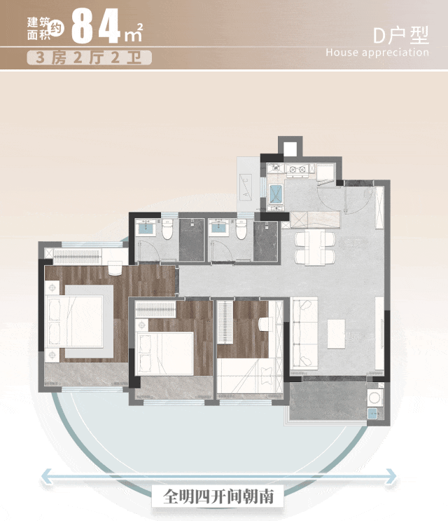 譬如建面约84㎡3房2厅,很多小户型会压缩入户空间,或者尽可能多地将此区域融入到创意空间。