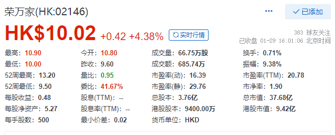 焦点财经快讯 1月29日,荣万家(02146.HK)开盘上涨12.5%,后震荡下跌。截至收盘,荣万家报10.02港元/股,涨4.38%,总市值37.68亿港元。