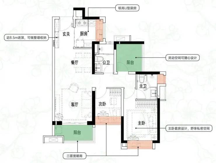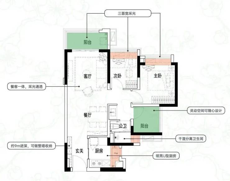 建面约84㎡3空间2厅2卫|得房率约93.5%