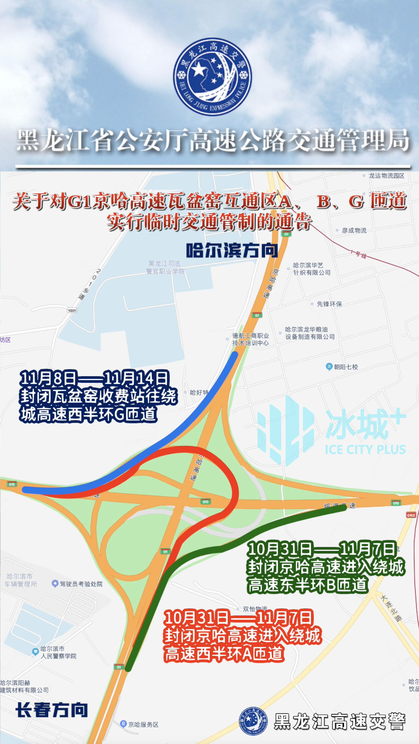 一、2021年10月31日至2021年11月7日,封闭京哈高速入省方向A(去往群力、松北、大庆、绥化方向)、B(去往朝阳、长江路、牡丹江、佳木斯方向)匝道。拟由A、B匝道进入哈尔滨环城高速去往上述方向的车辆请从瓦盆窑收费站驶出绕行前往。