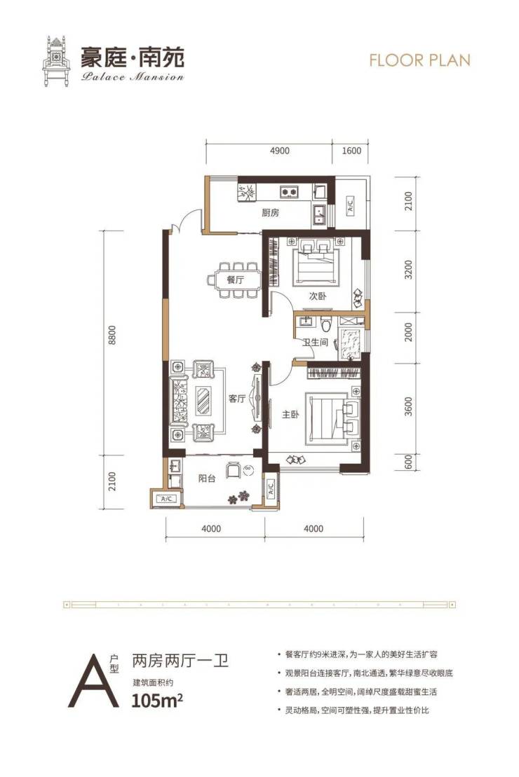 A、B户型为建面105平的2房刚需户型,全明空间,建面约8㎡的大阳台,朝南,极大满足生活需求;面积相对较小,总价较低,是年轻人置业的首选。