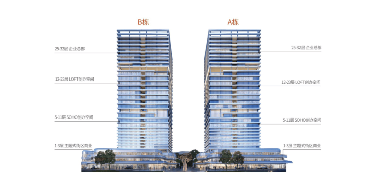 项目规划A、B两栋32层超高层办公楼(高度149米)以及C、D、E栋3层独立商业。打造集时尚、人文、艺术、商务、社交、生活6大功能于一体的“垂直社区”,涵盖办公空间、零售空间、生活空间、公共空间。