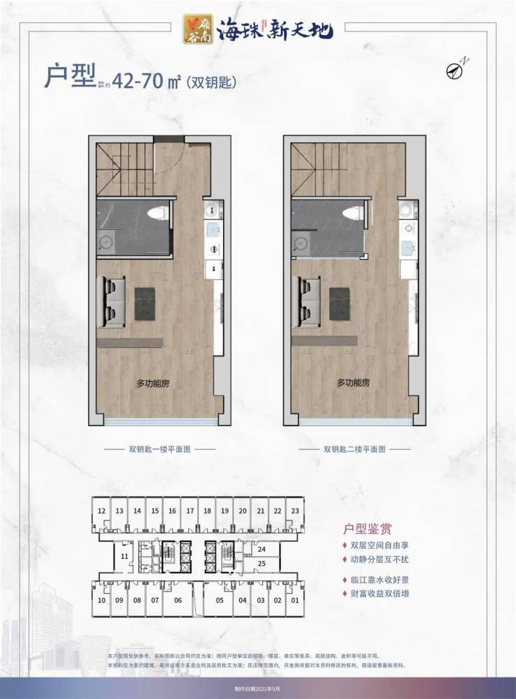 海珠新天地是一栋27层单体楼,其中1-4层是商业配套,6-24层是复式产品,25-27层是平层产品,总供货525套。