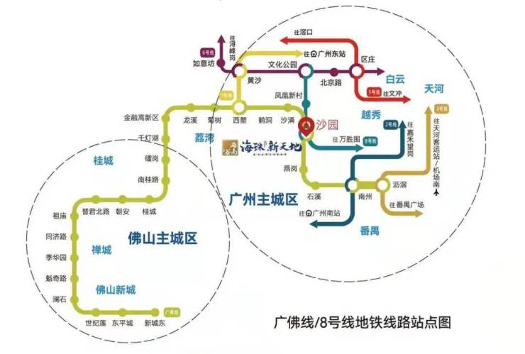 8号线、广佛线双地铁交汇畅达广州、佛山两大一线城市主城区;扼守海珠主干道工业大道,快速连接内环路,环城、广珠西线、迅达荔湾、天河、番禺、琶洲会展中心、广州南站、白云机场。