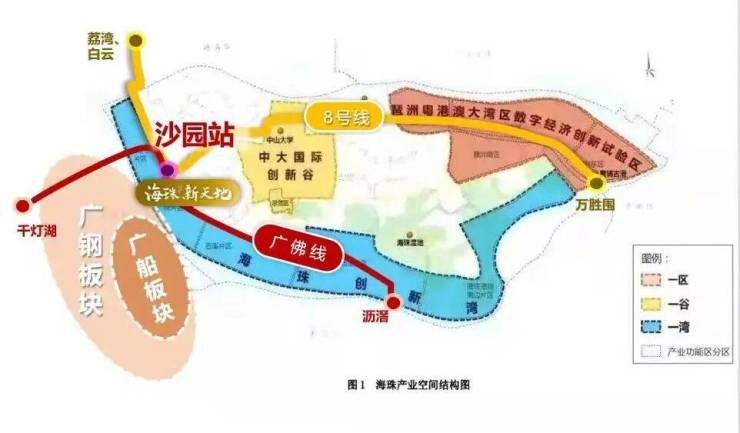 项目所在沙园站不但是串联海珠区未来千亿战略发展布局-“一区一谷一湾”的超级交通枢纽,更是海珠“一区一谷一湾”与荔湾区重点打造的广钢新城、广船新城乃至佛山千灯湖、禅城经济、消费、人口、文化连接交流的超级交通枢纽。