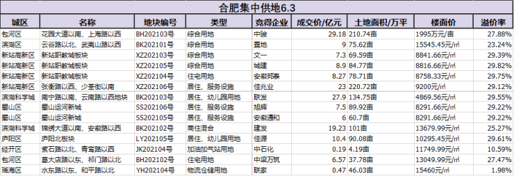 本次集中供地热度较高,除中石化竞得的一块加油加气站用地、联家竞得的一块物流仓储用地外,其余12块溢价率均超过20%。其中溢价率较高的地块由安徽邦泰以8.27亿摘得,该地块XZ202104号地块位于新站职教城板块,溢价率达29.75%。