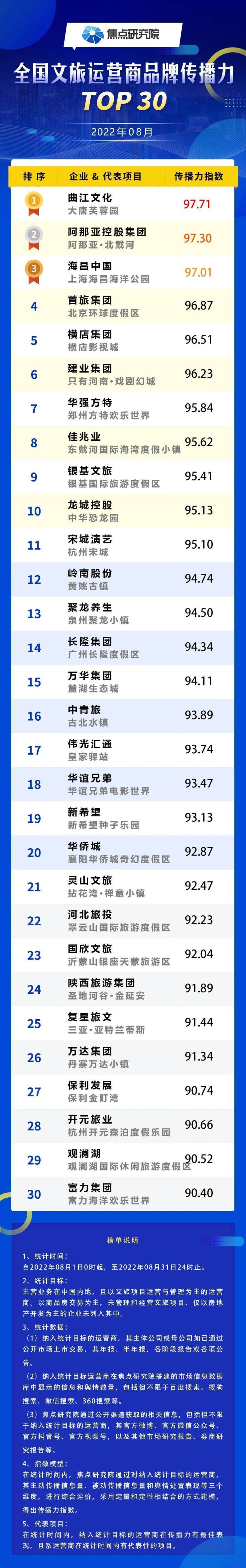 2022年8月,文旅运营商品牌传播力TOP 30榜单中排名前五的运营商依次为曲江文化(97.71)、阿那亚控股(97.30)、海昌中国(97.01)、首旅集团(96.87)和横店集团(96.51)。