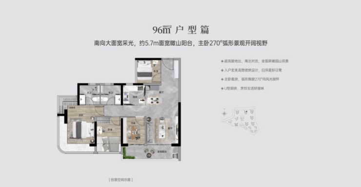 建面约96㎡ | 三房两厅一卫(A户型),礼仪式入户玄关,高效拓展收纳空间;约5.7m阳台,主卧270°弧形飘窗瞰山景。
