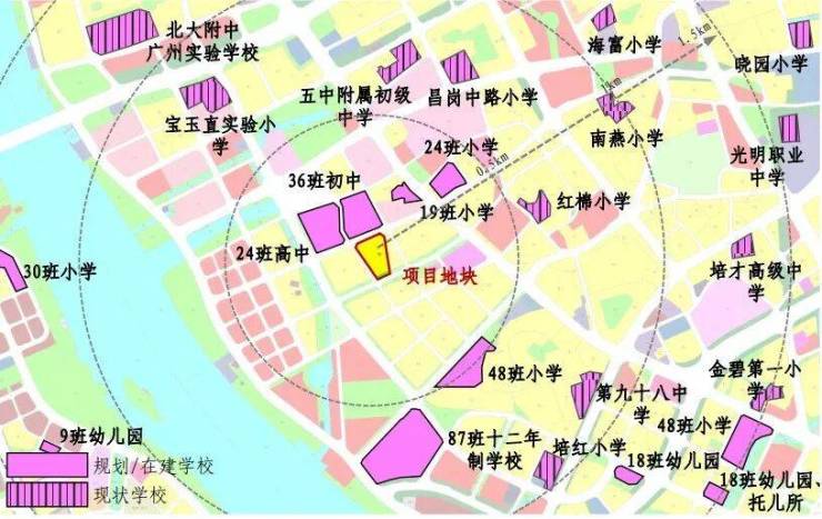 项目自身没有配建学校,但周边名校环伺,3km直线范围内包含广州市五中附属初级中学(省级)、广州市第41中学(省级)、宝玉直实验小学(光大校区)、江南外国语学校、工业大道中小学、红棉小学、海富小学、南燕小学、培红小学等9所学校环伺,拥有完善的区域教育体系。
