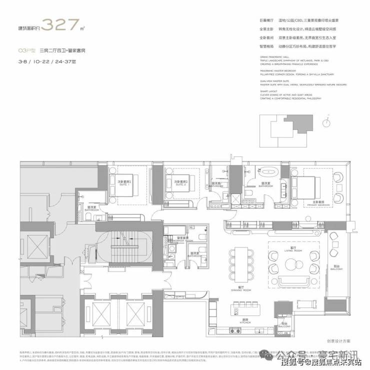 公寓主力户型为303㎡、326㎡、404㎡、572㎡等大平层,最大户型达1000㎡