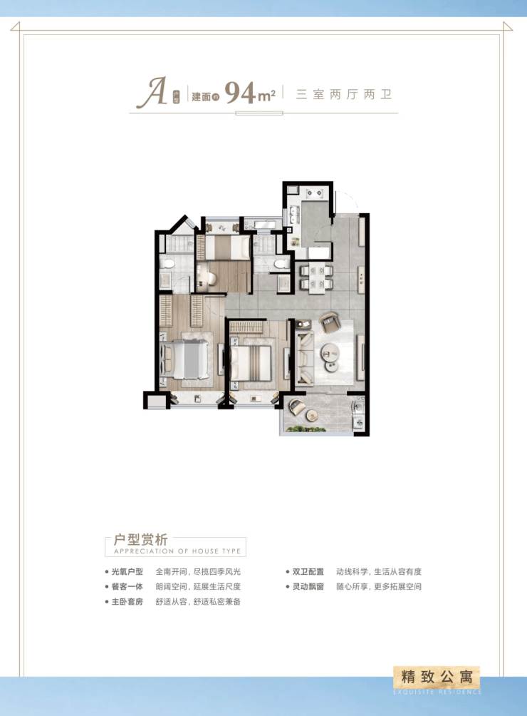 建面约94㎡3房2厅2卫户型特点:做到了三开间朝南+主卧套房设计+全卧飘窗+动静分离+卫生间干湿分离,功能性与空间感完美结合的3房“神户型”。