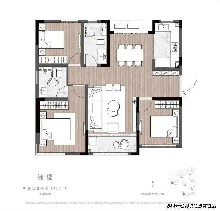 住宅户型:主力户型为 95㎡两室两厅一卫、120㎡三室两厅两卫、135㎡三室两厅两卫,均为 1 梯 2 户,且配有电梯等待厅。