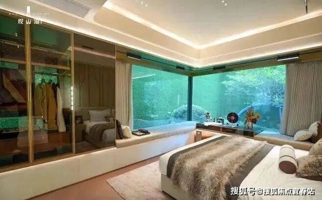 01户型主卧带约270°飘窗设计,三面山景、天际线被更大尺度地框入室内,成就一幅流动的天然巨幕。