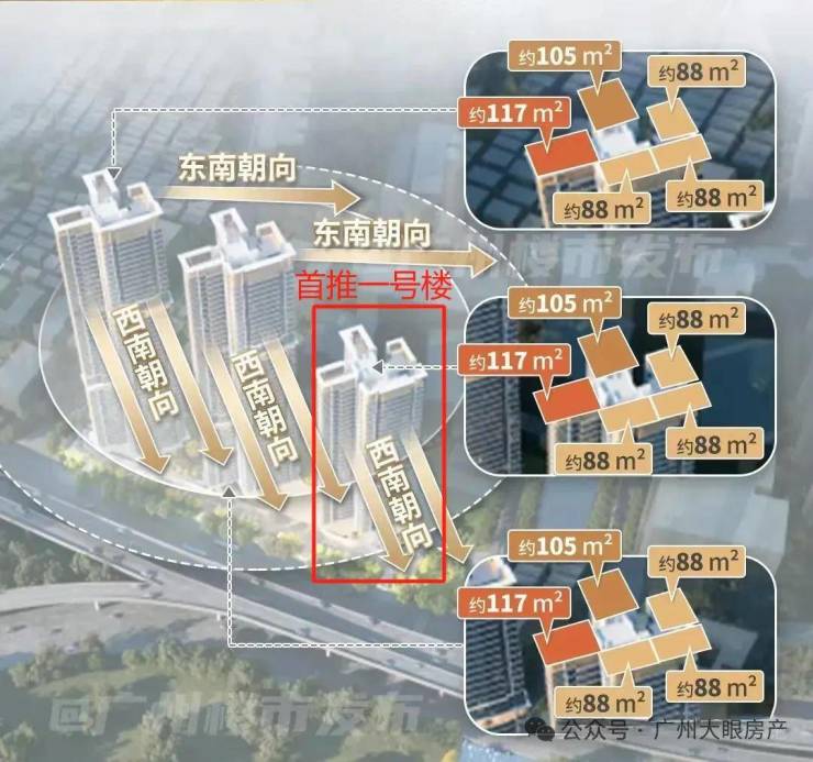 项目共规划有3栋楼,主推88-105-117平三个面积段。