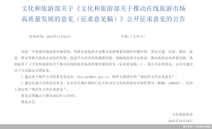 随着在线旅游企业数量不断增多,售卖“不合理低价旅游”产品、违规利用用户个人信息等问题也时有发生。11月1日,文旅部发布《文化和旅游部关于推动在线旅游市场高质量发展的意见(征求意见稿)》(以下简称《意见》),其中拟加强游客“行踪轨迹”等个人敏感信息保护,防止超出合理经营需要收集游客个人信息等行为。此外,还将针对平台经营旅游预售业务进一步探索,防控过度销售、履约困难和集资诈骗等潜在风险。在业内专家看来,《意见》明确了在线旅游平台的监管原则,有助于进一步规范在线旅游平台经营。