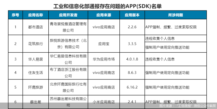 今年8月,工信部就对存在侵害用户权益行为的酒店餐饮类App进行了通报并提出了整改要求。其中,旅悦旅游信息技术(北京)有限公司旗下花筑旅行等App就因违规收集个人信息、强制用户使用定向推送功能被工信部要求整改。更早之前,高旅纵横、驴妈妈旅游等App也曾分别因为违规、超范围收集个人信息被工信部下架。