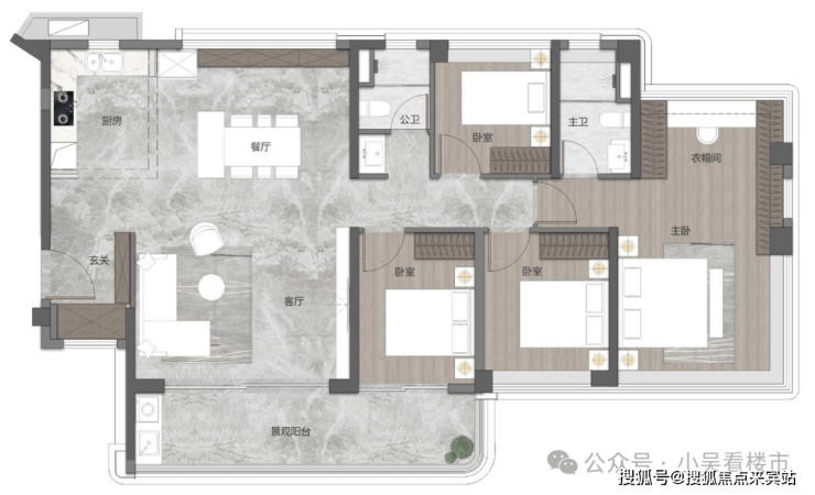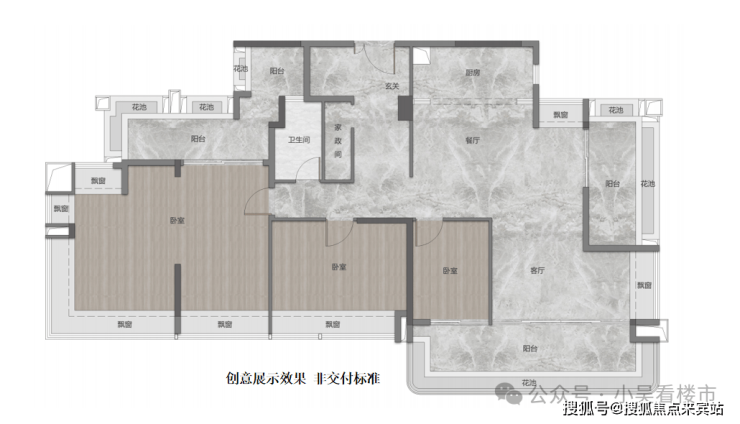 建面116平四房两卫,这个户型没有做板房,相当于138的缩小版,也是超宽阳台和客厅,主卧L型大飘窗,景观也比较好。