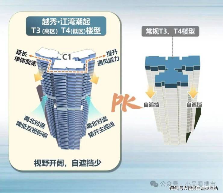 为了优化采光通风及提升窗景,越秀·江湾潮起对楼栋结构进行创新,第一个好处,户户都是理论上的边套和多面采光,让单体面宽延长之余,通风能力得到有效保证。
