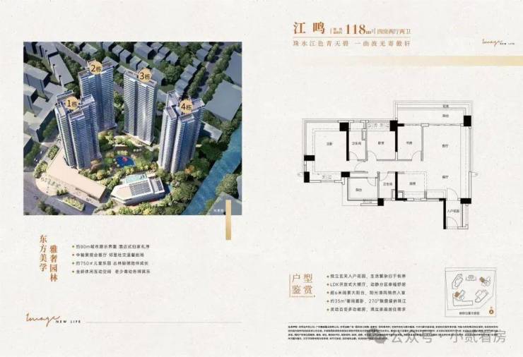 2、建面约118/122㎡:四房两厅两卫设计,共有2个户型可选,四开间朝南,居住与生活动静分离,南向大阳台或南北双阳台,主卧带270°飘窗。