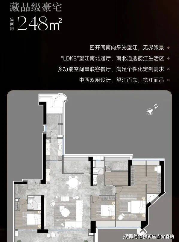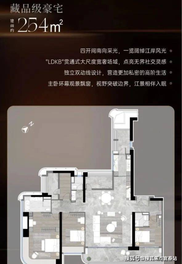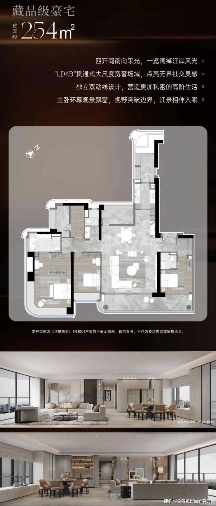 - 255㎡户型:四开间南向,南北通厅+双阳台,主卫四件套分离,专梯入户。