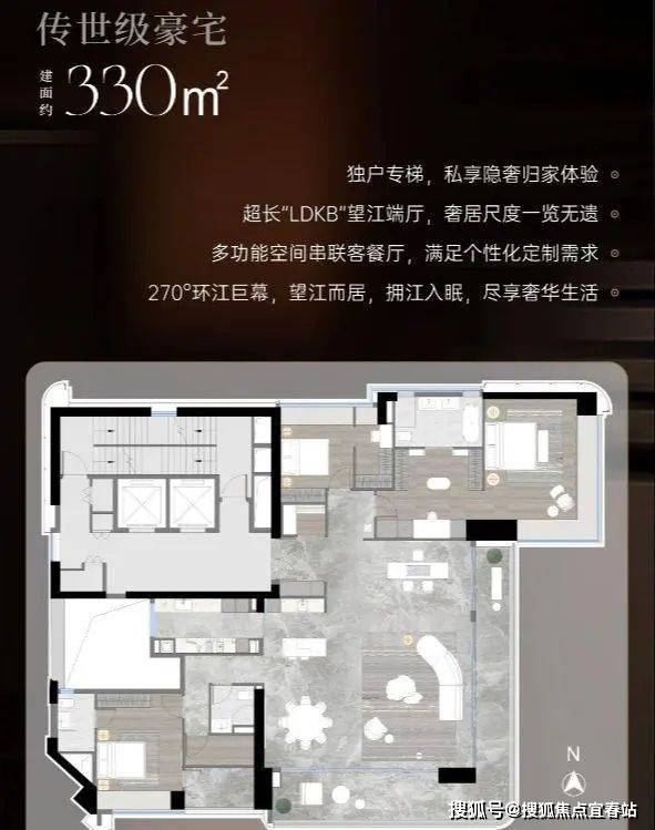 基本数据:占地2.37万㎡,总建面4.96万㎡,绿化率35%,仅1栋楼、96户,户型面积255-329㎡天际大平层,梯户比2梯1户/2梯2户,容积率低至2.09,定位纯粹高净值圈层。
