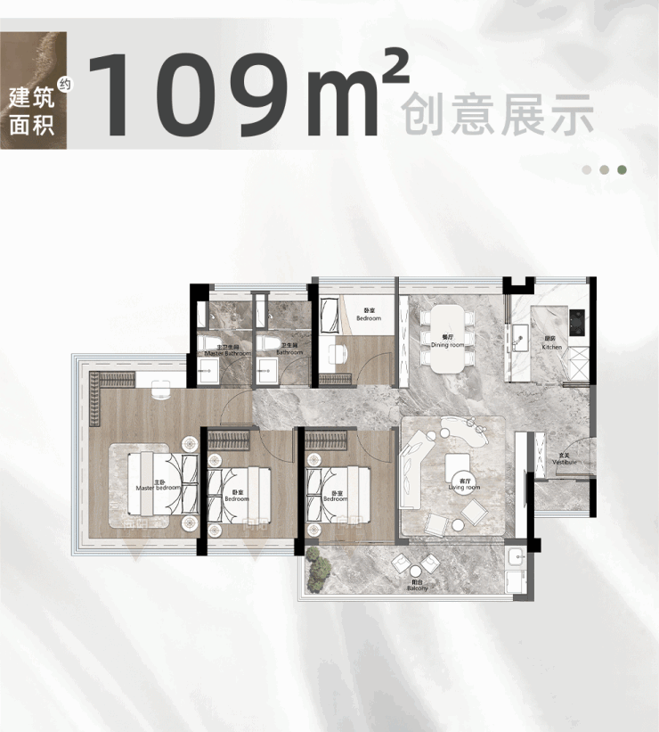 109㎡4房2厅2卫,实现了南北通透。三面环幕视野、800库收纳柜,进阶版的4房空间。