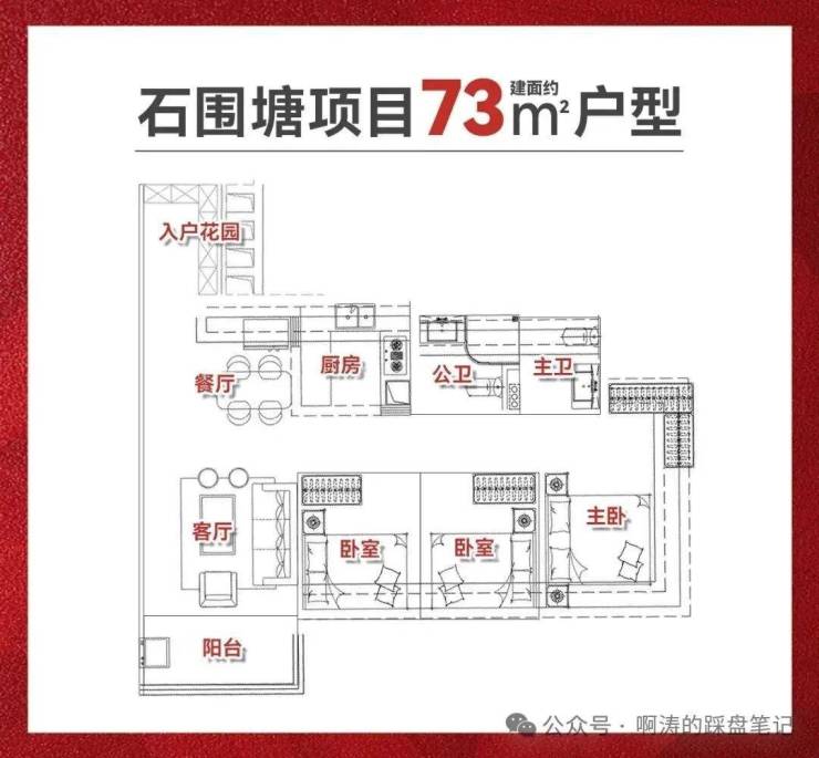 约73㎡三房,两个户型相似,主卧可以实现270°观景,还有衣帽间和独立卫生间。不过,独卫面积较紧凑,难做干湿分离。