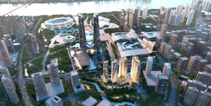 建筑外立面设计灵感来源于杭州自古享有盛名的"织锦",流畅的线条犹如灵动的"丝绸"倾泻而下,映射着奥体充满活力的城市景观。项目因地制宜,不同于传统的以商业为主的高密度综合体,引入各式裙楼、极具活力和公共性的开放空间,创造一个大尺度的“城市客厅”,打造一个动态有活力的村落式城市综合空间。