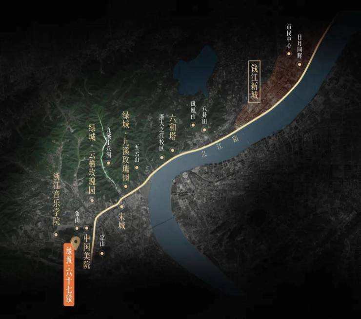 背枕西湖群山,面向钱塘江水,蜿蜒其中的之江大道,串联着岁月的故事与未来的憧憬。从承载着历史沧桑的六和塔,到闪耀着现代光辉的钱江新城;从古木参天的九溪玫瑰园,到洋溢着艺术气息的中国美院象山校区,六十七象安然静卧,沐浴着城市发展的璀璨辉芒。