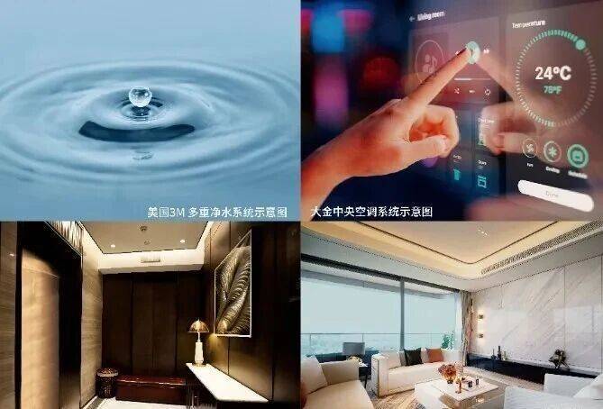 采用国际一线品牌交付标准,引入美国3M多重净水系统、日立电梯、德国旭格门窗与大金中央空调系统