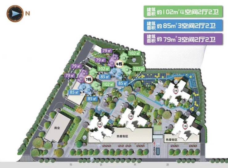 只有79㎡、85㎡、102㎡三种户型,偏刚需。
