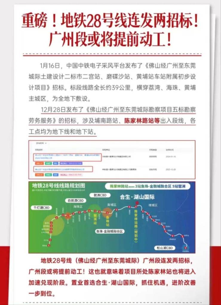 还有规划中的28号线的陈家林路站,距离项目大概只有900米左右,目前规划站点在合生湖山国际那边,但还是存在一定的不确定性,地铁建好开通以后,坐地铁去天河、海珠、黄埔等区也非常方便。