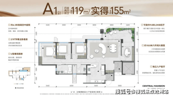 比如建面约106㎡为三房设计的户型,可以减少一个卧室将巨厅进一步放大,变幻为奢阔两房户型。也可以将巨厅改为竖厅从而增加一个房间,演变为紧凑四房户型,对外出租获得更高租金受益。
