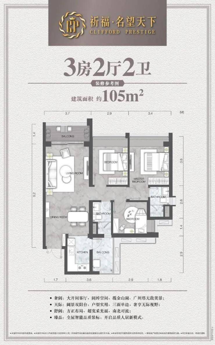 广州祈福名望天下(别名:祈福名望阁)位于番禺区市广路祈福新邨内,高达179米,是区域内的地标性建筑。项目周边交通便利,紧邻地铁22号线和规划中的26号线,且配套完善,包括祈福缤纷世界等大型商旅综合体,以及多所知名学校和国际JCI认证医院。祈福名望天下提供78-175㎡的二至四房户型,户户南北对流,三面单边,是追求高品质生活的理想选择。