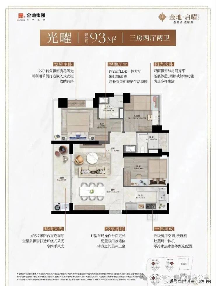 93㎡的3房2厅2卫,2栋1/2/3单元01户型,设计的是横厅南北通透格局,客餐厅5.7米开间,LDK一体化方厅约23平,主卧+次卧270°转角飘窗,U型厨房,公卫三段式干湿分离,得房率约90%(包含赠送),客厅连接餐厅出5.7米长的大阳台,西南或东南朝向。