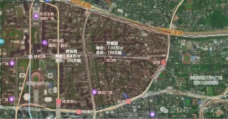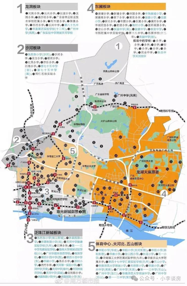 第二个是天河北板块, 珠江新城后花园,定位于老牌商务区和教育高地 ,华阳小学/龙口西小学+广州中学组合是天河公立教育天花板。该板块曾经是天河的中心,20多年后随着珠江新城的崛起逐步走向没落,现在主要以二手房为主,楼龄多在15-20年,价格:8-15万元/方。新盘主要在泛天河北板块,价格5-8万元/方。