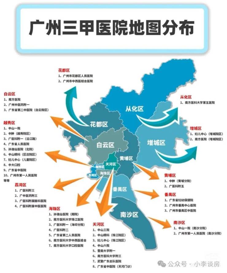 再次是医疗资源,拥有多家三甲医院和专科医院,包括中山大学附属第三医院(天河院区)、广州市妇女儿童医疗中心(珠江新城院区)、暨南大学附属第一医院(广州华侨医院)、南方医科大学第三附属医院(广东省骨科研究院)等,未来规划金融城三甲综合医院。