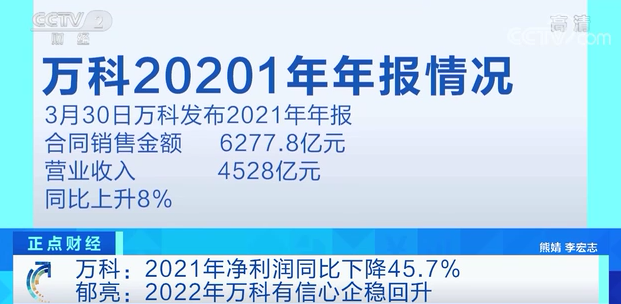3月30日晚间,万科企业股份有限公司公布2021年年报数据。年报显示,2021年万科实现营业收入4528亿元,同比增长8%;归属于上市公司股东的净利润225.2亿元,同比下降45.7%。