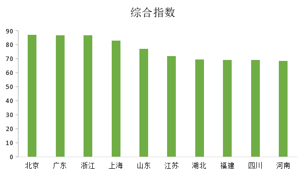 分区域看,中国省市文化产业发展综合指数不同区域差距较大,东部地区10省市综合指数平均得分远高于中部、西部、东北地区;中部地区6省综合指数平均得分略高于西部、东北地区;西部地区和东北地区得分基本持平。其中,综合指数得分前十名的省市中,前6名位于东部地区。