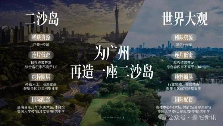 皆因两者坐拥「稀缺生态资源」——二沙岛拥江景与公园,世界大观则享湖区与公园环绕;均采用「连片低密开发」模式,由越秀统一运营,板块综合容积率低至约1.04;「圈层纯粹」,二沙岛以外籍人士、港澳富商、行业领袖为主,世界大观则以互联网IT新贵、高知精英等为主,业主圈层高度一致;更同样具备「国际配套」,二沙岛拥有星海音乐厅、广东美术馆、美国人学校和执信中学,世界大观则汇聚奥体中心、美国人学校、贝赛思和执信中学等资源。