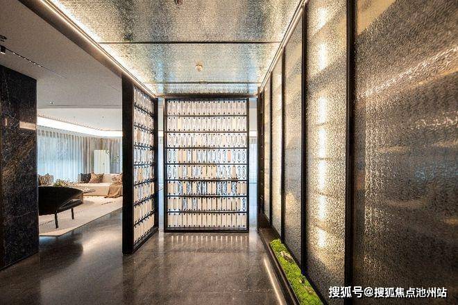 穿过电梯前厅,来到 “月光宝盒” 玄关照壁处。这里巧妙融合了山西大院影壁文化,选用珍贵的天然玉石与晶莹剔透的水晶玻璃砖,通过精湛工艺打造,自地面到天花一气呵成,形成一道极具艺术感染力的屏风。它不仅在视觉上带来震撼的美感,更承载着家宅兴旺、凝神转运的美好寓意,让每一次归家都充满仪式感与文化底蕴。
