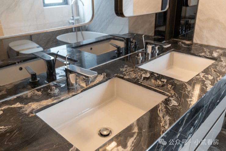 约200平的顶豪户型,则在此基础上对卫浴进行升级,使用奢石打造台面。