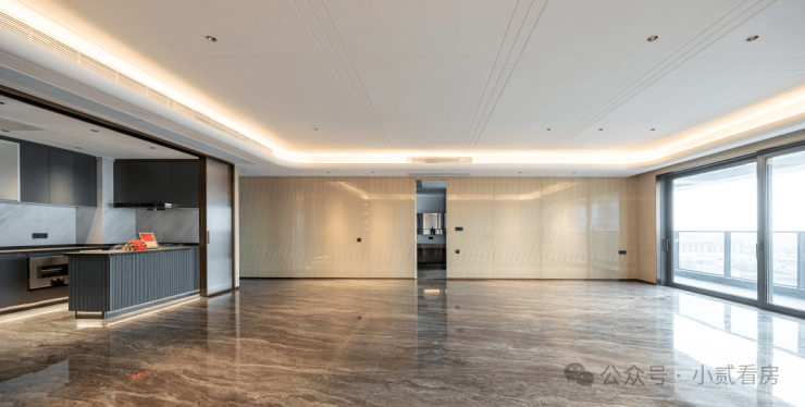 这种近乎奢侈的用材用料,被同步到了湖光悦色的室内交标中。除200平顶豪户型外,其余户型一律标配花纹连贯的岩板背景墙,同时,地面铺装、玻璃分隔,全部使用大块面切分。