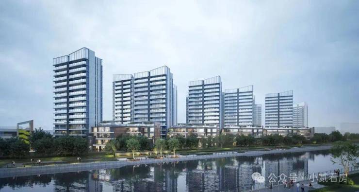 户型排布从石榴岗河自东向西依次升高,保证了约300米宽的生态水景面。