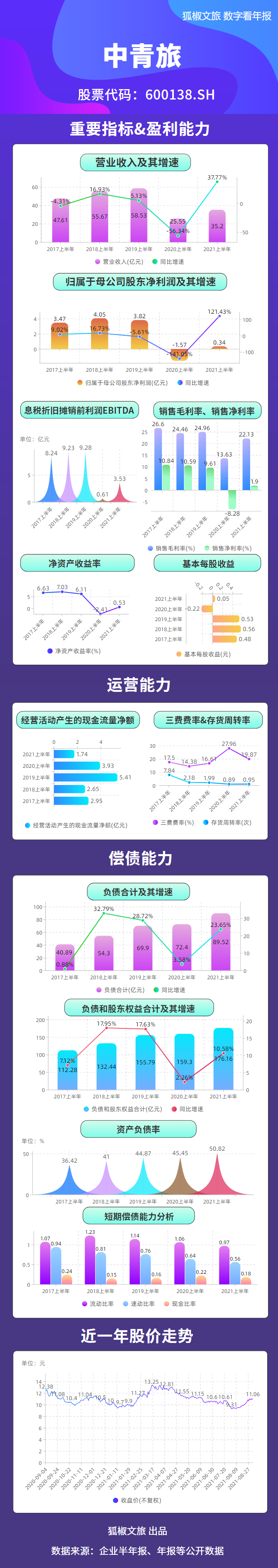 归属于母公司股东净利润方面,2017上半年至2021上半年同期,中青旅归属于母公司股东净利润分别为3.47亿元、4.05亿元、3.82亿元、-1.57亿元和0.34亿元。今年上半年数据虽有所回升,但仍未回归至疫情前水平。