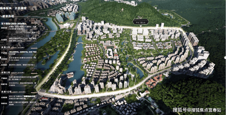 临春片区以“让城市融入自然”为前瞻性规划理念,采用“绿楔渗透、一心两轴、三点多廊”结构,将山、河、公园等生态资源融入城市肌理: