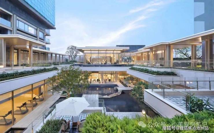 整个项目在杭州刚需楼盘里最卷的部分是做了6米高差的下沉式庭院,在不同的高度做了包厢式观景平台,周围是立体式山水景观,下面是两大片镜面水景,铺以高度错落的石桥和绿植,移步易景,充满了自然的野奢味道。